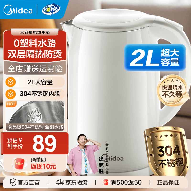 美的(Midea)2L大容量电热水壶 1800W家用快速沸腾电水壶烧水壶 不锈钢无缝内胆双层防烫热水壶 2L 【304不锈钢】
