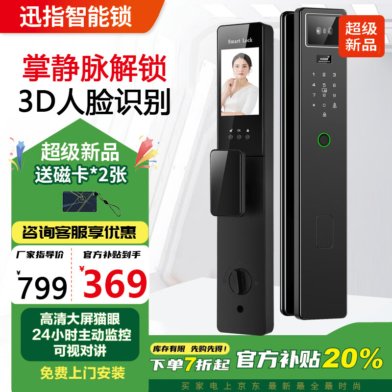 迅指掌静脉智能门锁指纹锁3D人脸识别智能锁家用入户防盗门电子密码锁 S05【人脸识别+掌静脉+可视对讲】 【自行安装视频指导】
