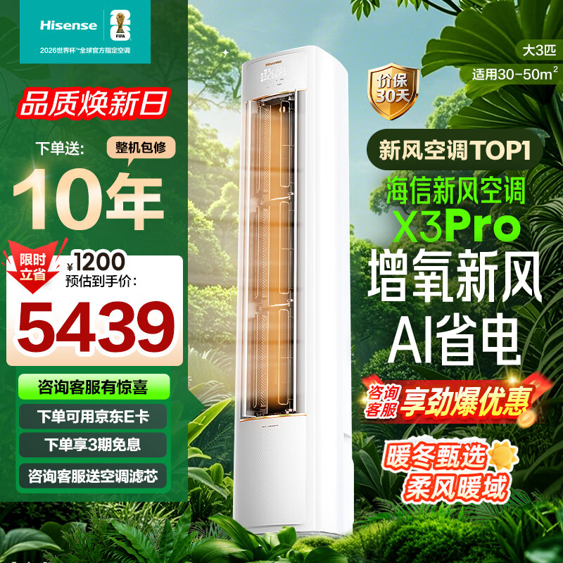 海信(Hisense)新风空调X3Pro 3匹 增氧新风 AI省电 超大新风量 国家补贴20% 大客厅柜机 KFR-72LW/X300Pro-X1 大3匹 一级能效 【咨询客服享优惠】