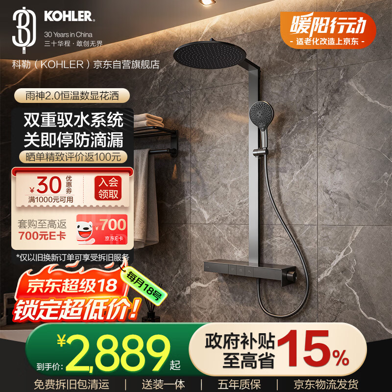 科勒(KOHLER)雨神2.0恒温花洒淋浴套装花洒喷头进口阀芯送装一体包清运 墨影灰