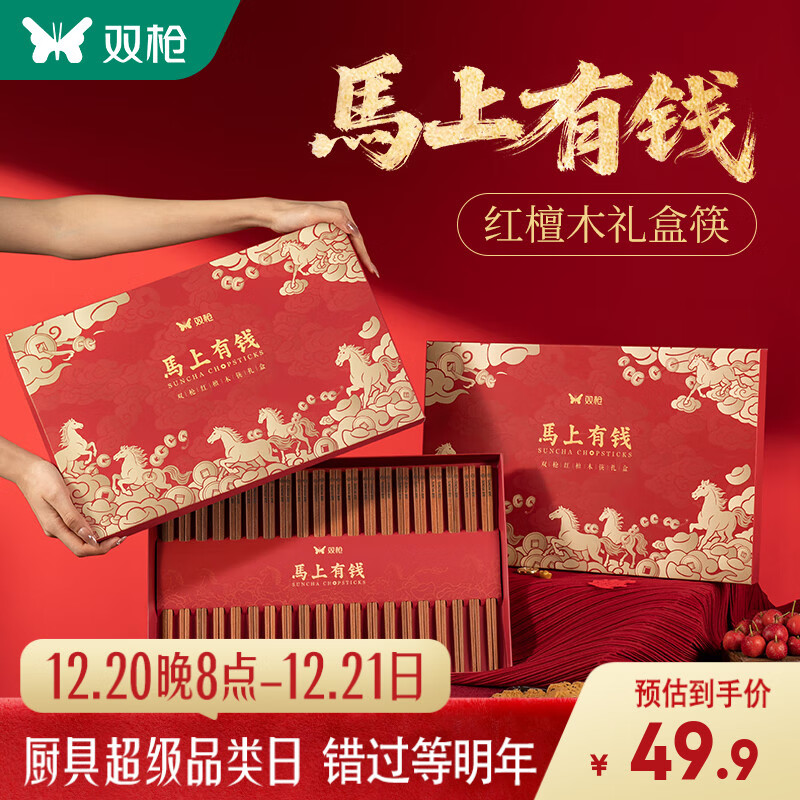 双枪马上有钱红檀木筷子家用礼盒装新年春节高档中式餐具礼品 【马上有钱】红檀木礼盒筷 20双