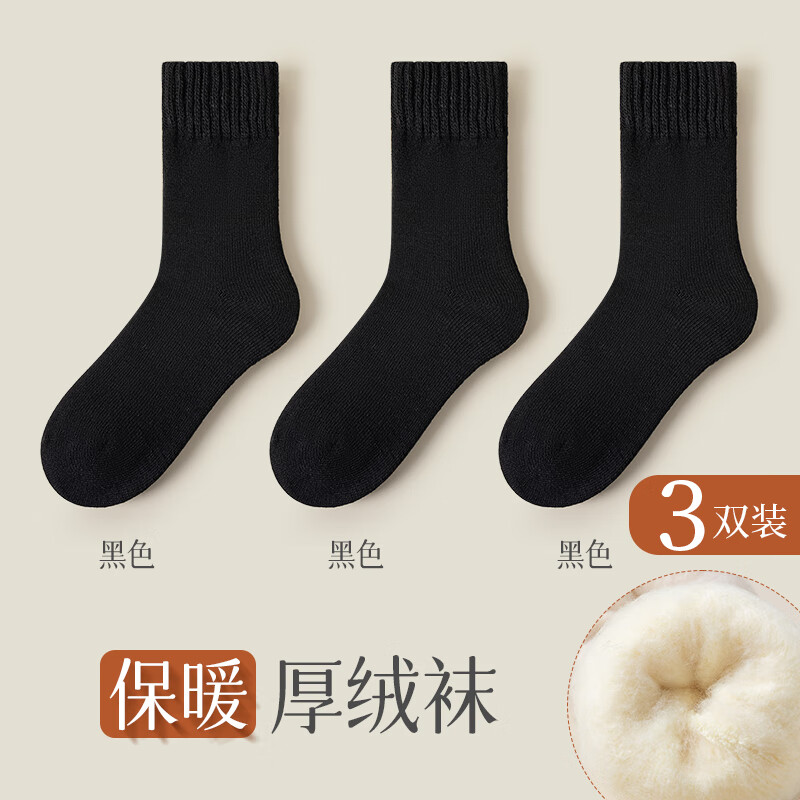 BANILACOO袜子女秋冬中筒袜加绒加厚毛绒长筒月子袜地板发热保暖毛圈长袜 【3双装】3黑色 均码 (加绒加厚)