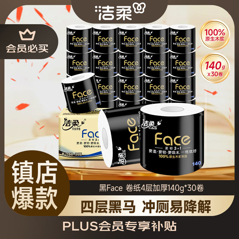洁柔有芯卷纸 黑Face4层140克*30卷 耐用厕纸擦手卫生纸巾整箱8.4斤