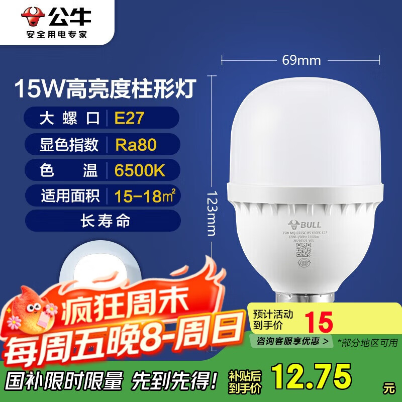 公牛(BULL)LED灯泡高亮球泡柱形灯厂房车间商超食堂15W球泡白光6500KE27螺口