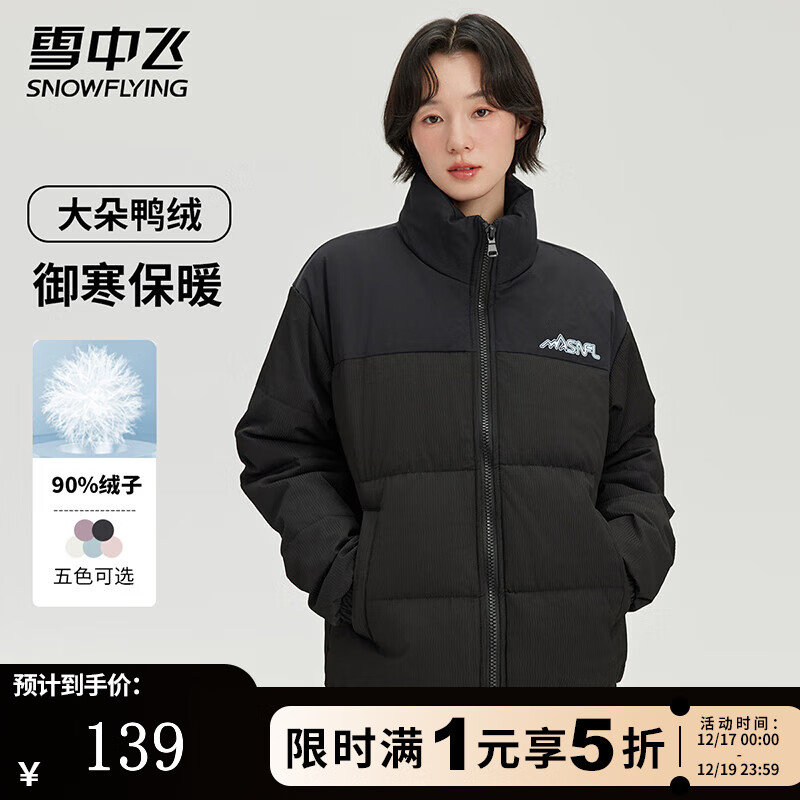 雪中飞羽绒服春季女士立领防寒拼接撞色纯色简约休闲肌理感面料羽绒外套 黑色【男女同款】 M (170)