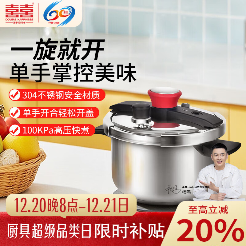 双喜高压锅304不锈钢燃气电磁炉通用家用防爆压力锅单手开合22CM/4L