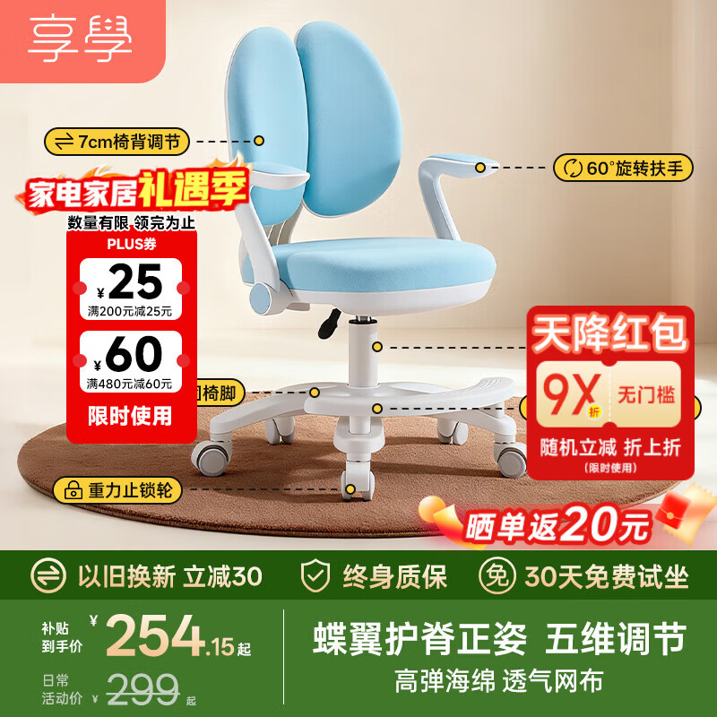 享学儿童学习椅儿童座椅写字学习椅可调节升降追背正姿学生椅 XC501蓝