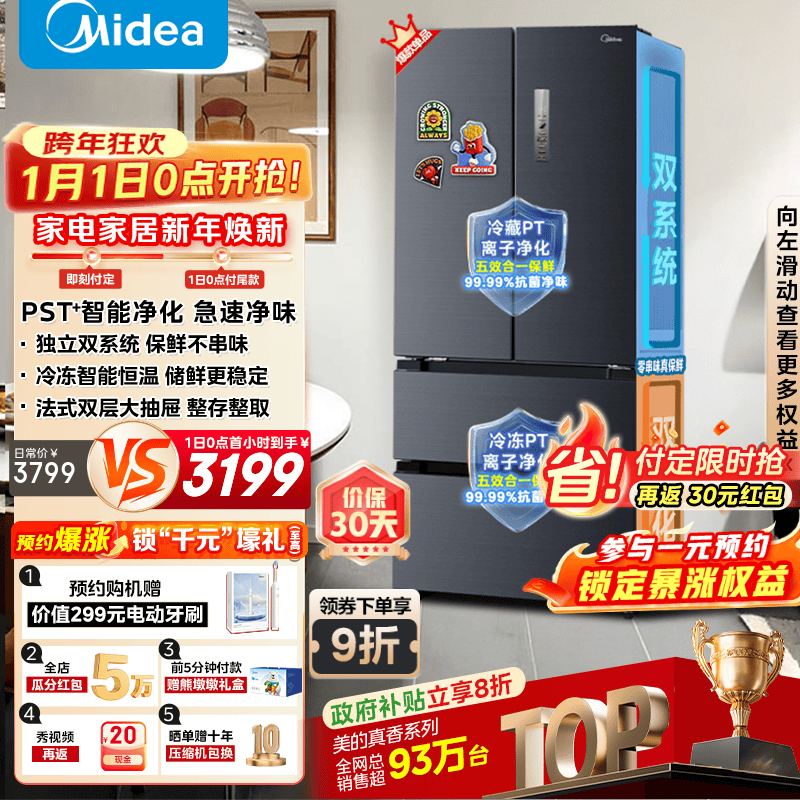 美的(Midea)508升法式多门家用电冰箱除菌净味双系统大容量冰箱家电国家补贴真香系列 BCD-508WTPZM(E) 508升双系统净味冰箱