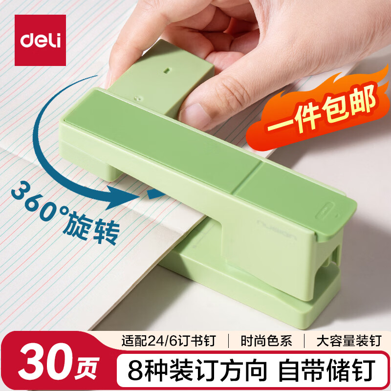 得力(deli)纽赛时尚旋转订书机/订书器 学生作业本办公可钉中缝 NS089-2沙普绿