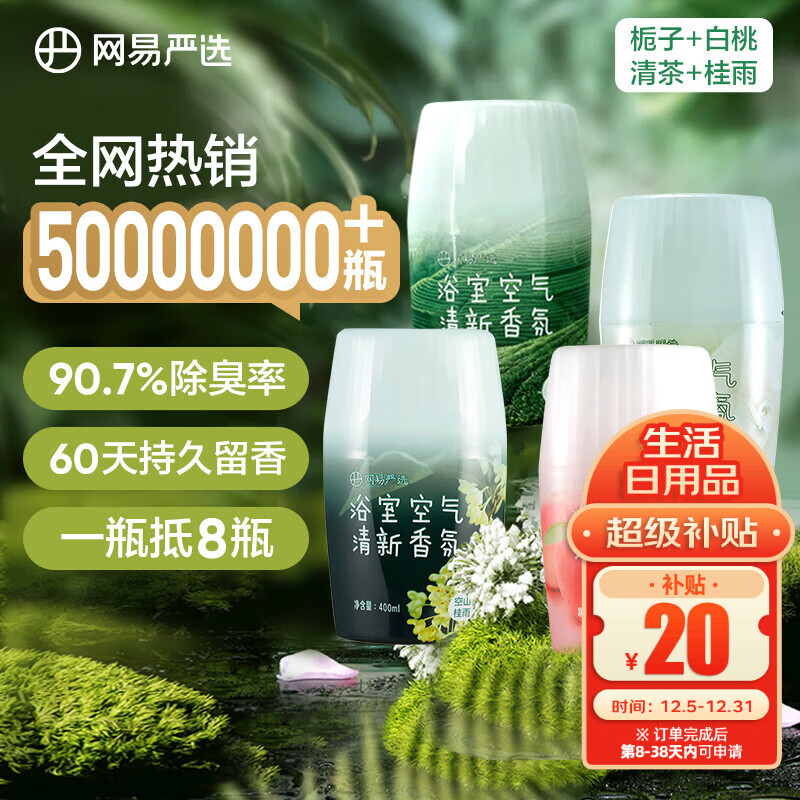 网易严选浴室香氛香薰空气清新剂厕所除臭400ml*4栀子+白桃+清茶+桂雨