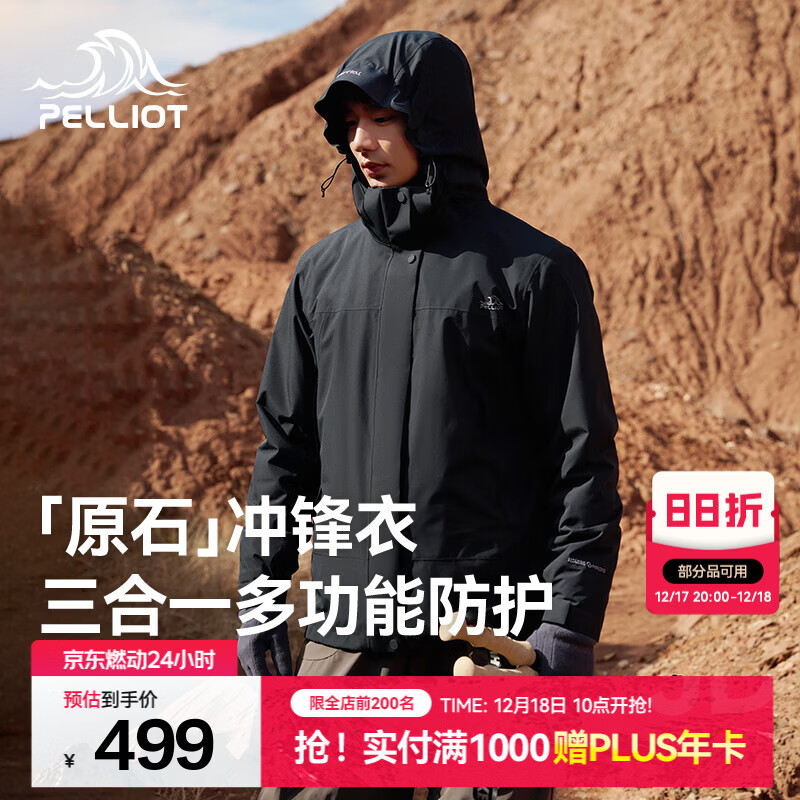 伯希和(Pelliot)【成毅同款】原石冲锋衣三合一男女保暖外套抓绒内胆夹克登山服 【男款】漫暮黑 S