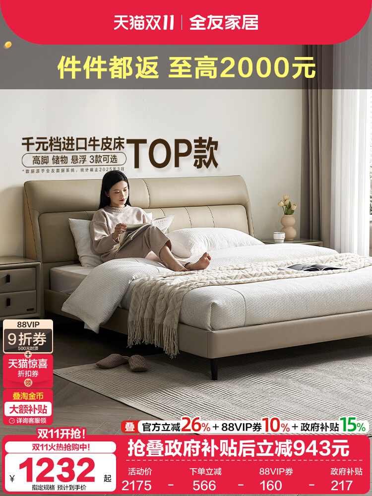 政府补贴全友家居主卧室大床高端大气软包真皮悬浮床1米8双人床