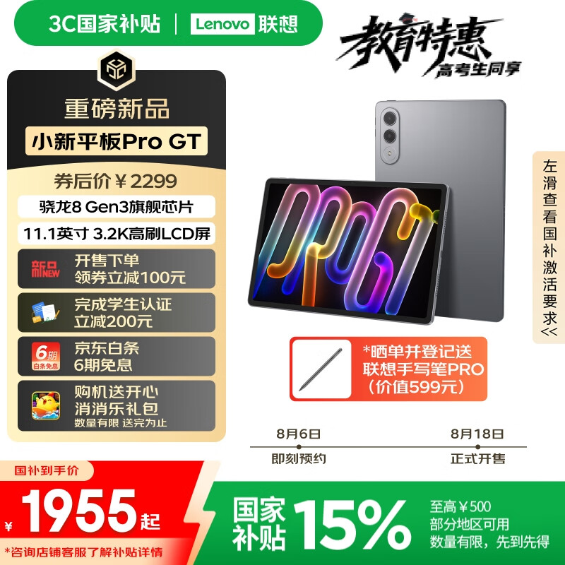 联想(Lenovo)小新平板ProGT 11.1英寸3.2K超清144Hz高刷 骁龙8Gen3 办公学习游戏便携AI平板电脑 12+256G信风灰