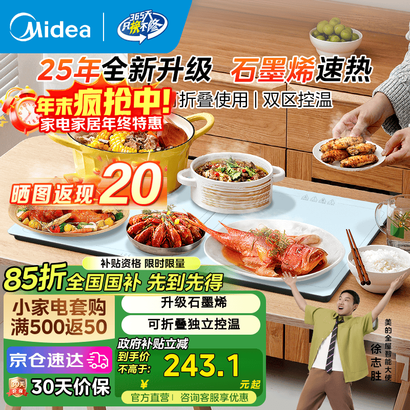 美的(Midea)折叠暖菜板热菜板家用多功能方形60/80cm饭菜保温板加热板1分钟快速升温双档电热餐桌板垫保温神器 【25年升级石墨烯速热】6038FZ Pro 60cm