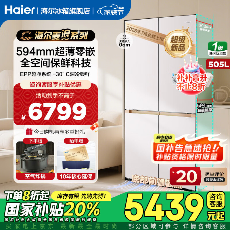 海尔(Haier)冰箱麦浪505升全空间保鲜594mm专业超薄零嵌十字四开门多门一级能效双变频大容量家用电冰箱 麦浪505L+全空间保鲜+EPP除菌+超薄零嵌入