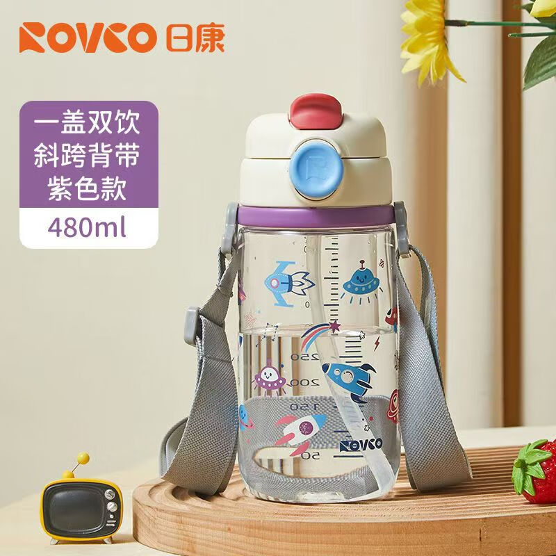 日康(rikang)水杯儿童双饮口吸管杯学生水杯便携水壶480ml B1072-2 茄皮紫