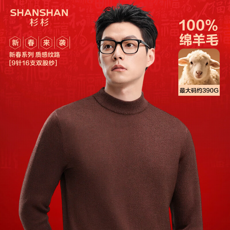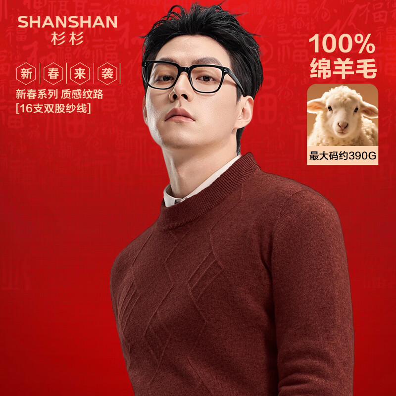 SHANSHAN杉杉纯羊毛衫男秋冬100%绵羊毛加厚保暖柔软毛衣男休闲圆领上衣 红棕色 S /165