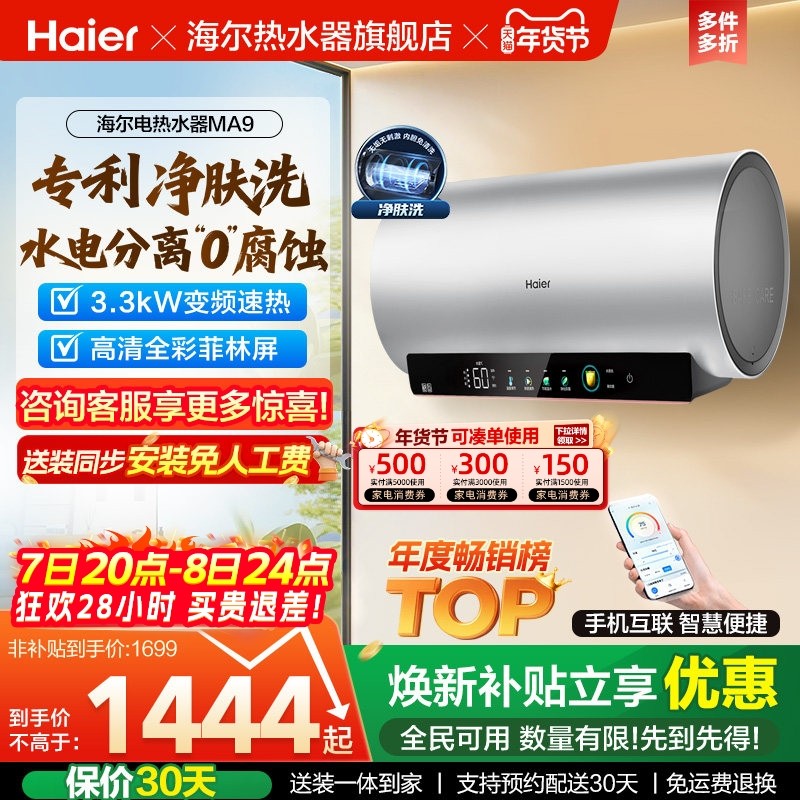 海尔电热水器以旧换新官方节能速热60升净肤洗澡一级能效家用MA9