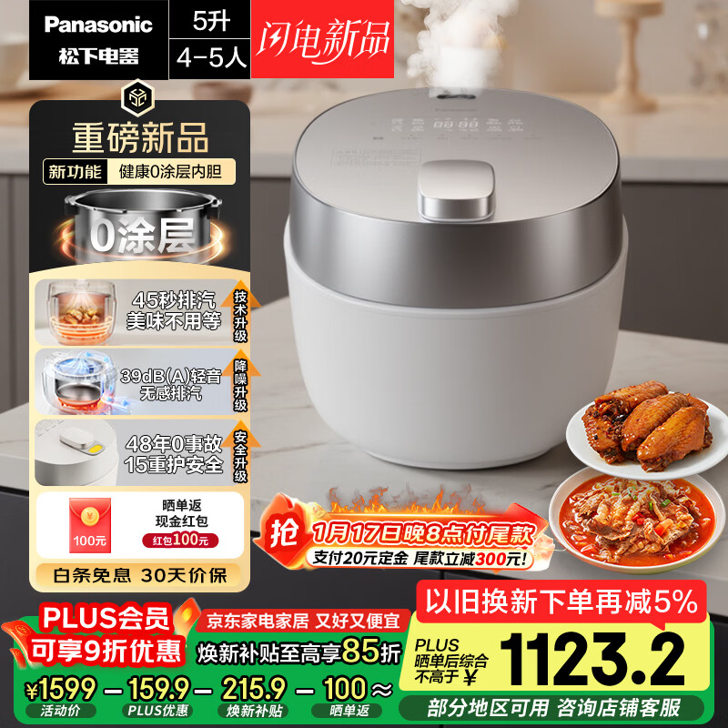 松下(Panasonic)小元煲电压力锅0涂层高压锅5L家用无涂层电饭煲4-5人不锈钢多功能饭锅智能预约蒸煮炖NF-PDS500-W
