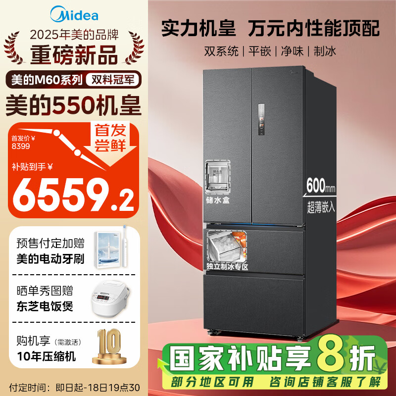 美的(Midea)机皇550法式多门超薄纯平全嵌一级除菌净味双系统大容量家用制冰一体机冰箱MR-550WUFIPZE海贝黛