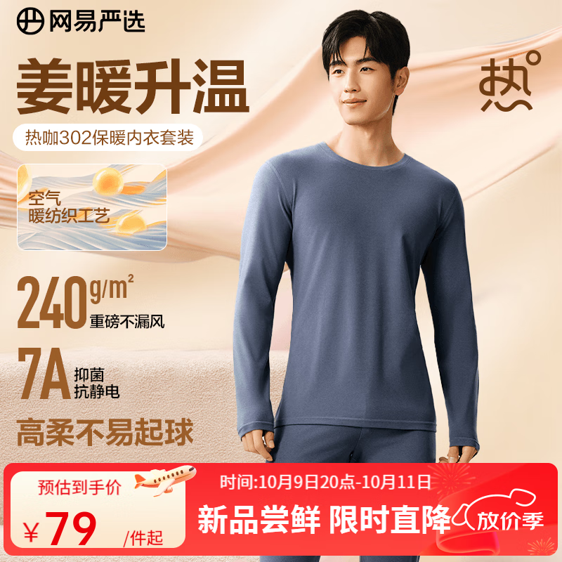 网易严选新品热咖302暖姜保暖内衣240g重磅7A抗菌柔软透气不闷汗秋衣套装 A款240g升级-暮云蓝-男款 L