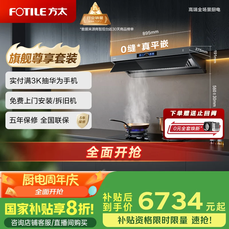 方太(FOTILE)抽吸油烟机灶具家用【旗舰尊享烟灶套装】国家补贴 顶侧一体28风量+定时防干烧灶 V1S-G+02-TEK20