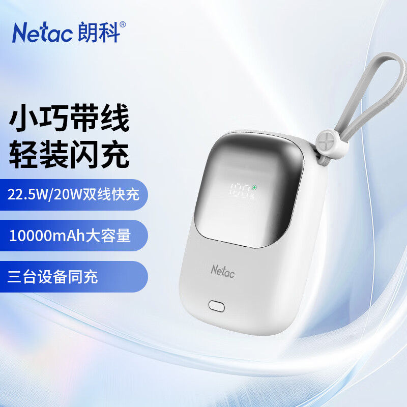 朗科(Netac)3C认证可上飞机充电宝10000毫安自带线22.5W快充移动电源轻薄便携适用苹果17华为小米 白色