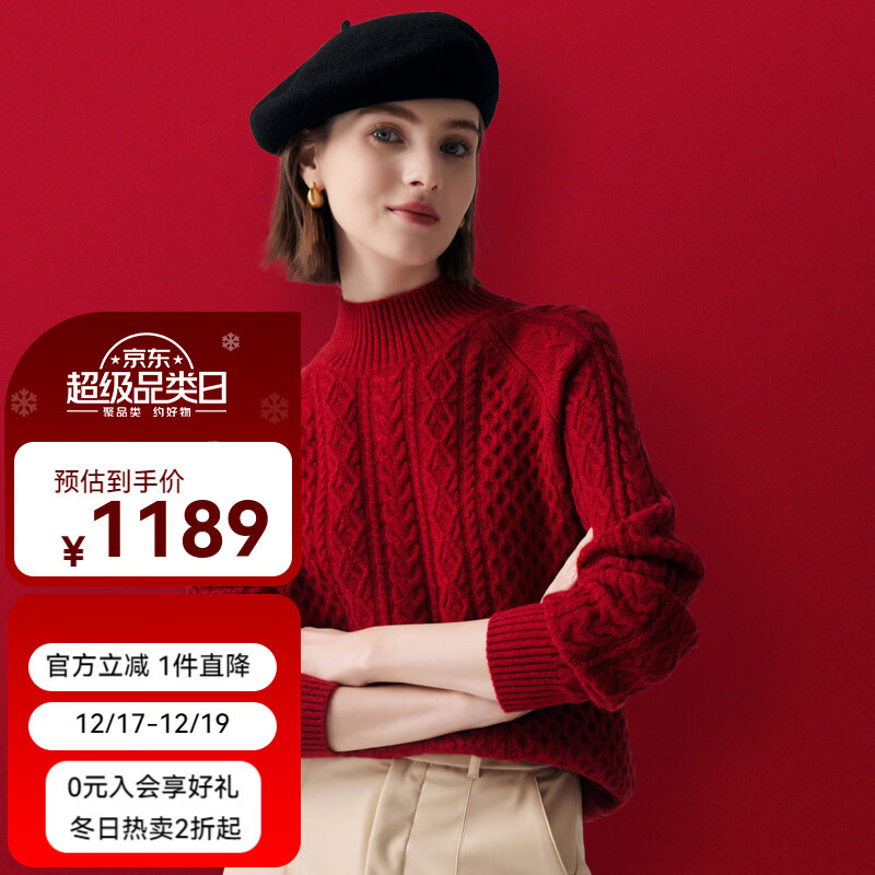 PALUOPO25冬季新款纯色半高领绞花女纯羊绒衫套头衫保暖毛衣ET20067R 大红夹花 L (105)
