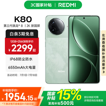 小米REDMI 红米K80 国家补贴 5G手机 第三代骁龙8 IP68防尘防水 6550mAh大电池 小米澎湃OS 山峦青 12GB+256GB