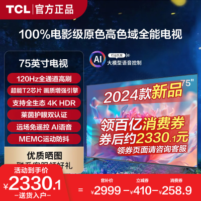 TCLµçÊÓ 75Ó¢´ç120Hz¸ßË¢ »ÖÊÔöÇ¿ÒýÇæ 4K³¬¸ßÇå¸ßÉ«Óòƽ°åµçÊÓ