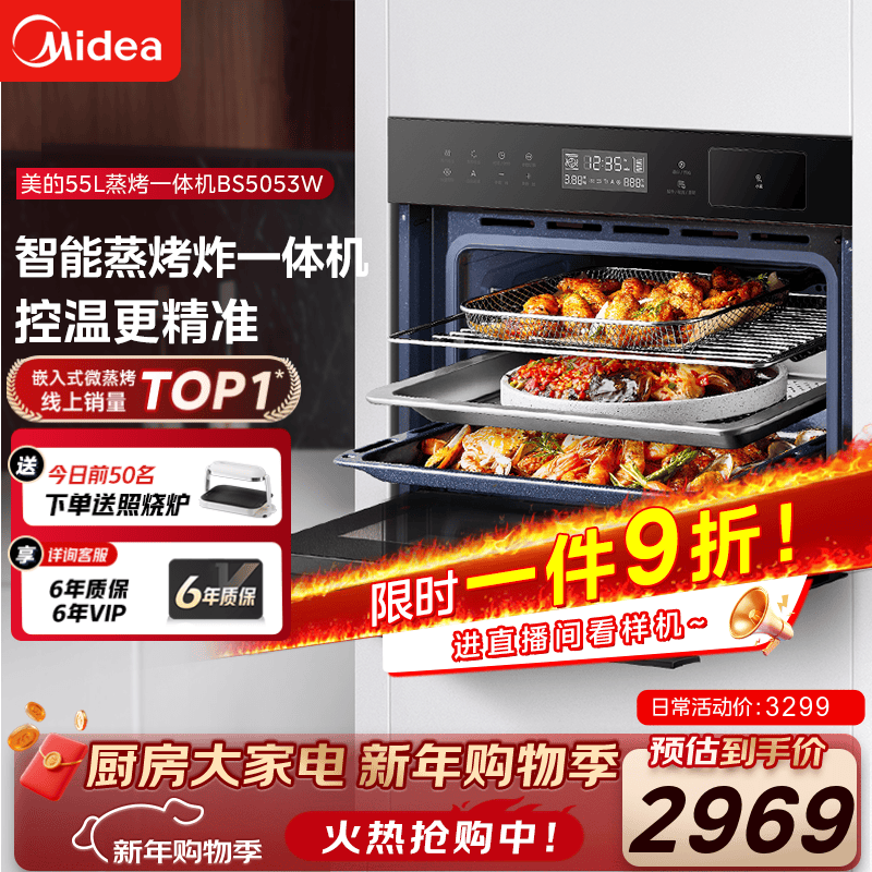 美的(Midea)蒸烤箱一体机嵌入式家用蒸烤箱55L大容量蒸烤一体机 APP智控搪瓷内胆蒸箱烤箱蒸烤炸三合一BS5053W