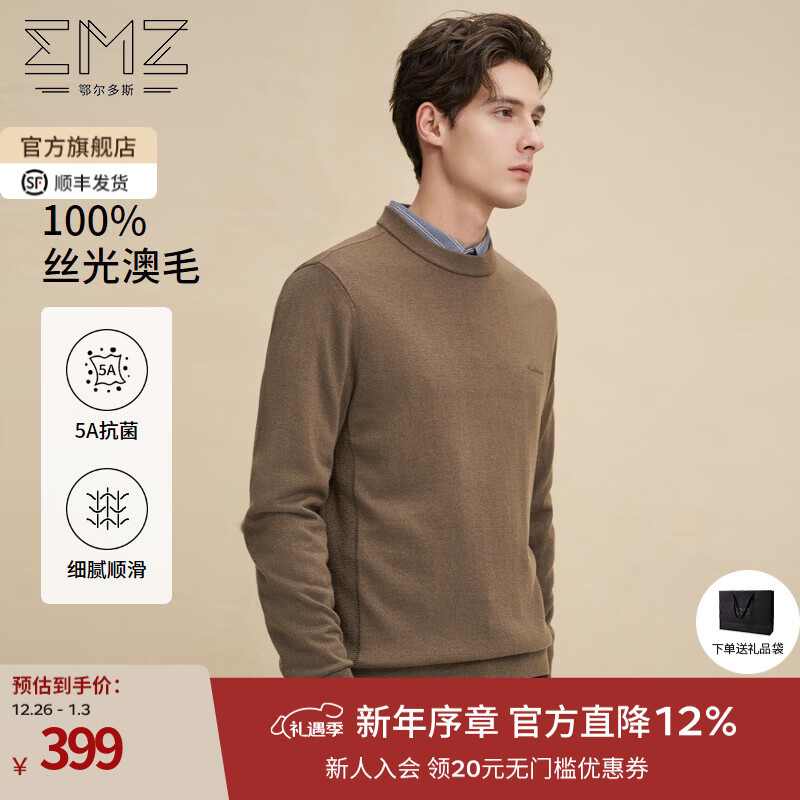 EMZ鄂尔多斯骐骥红【羊毛衫男毛衣】抑菌含羊绒保暖打底针织羊毛衫男 [圆领款-2]中卡其 L 175/92A