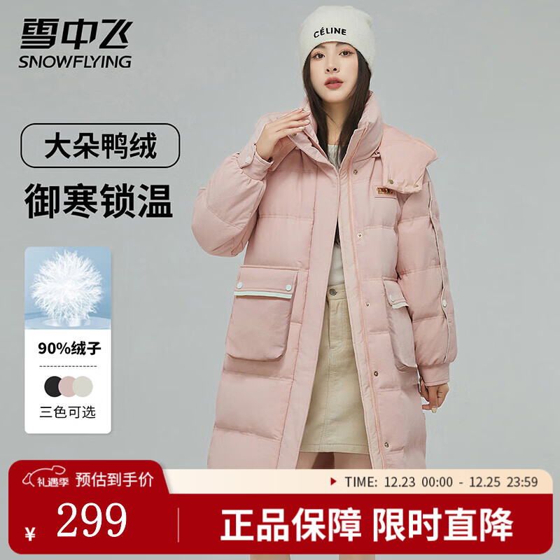 雪中飞羽绒服冬季女士中长款收腰撞色拼接御寒保暖时尚派客服羽绒衣外套 粉色 S (155)