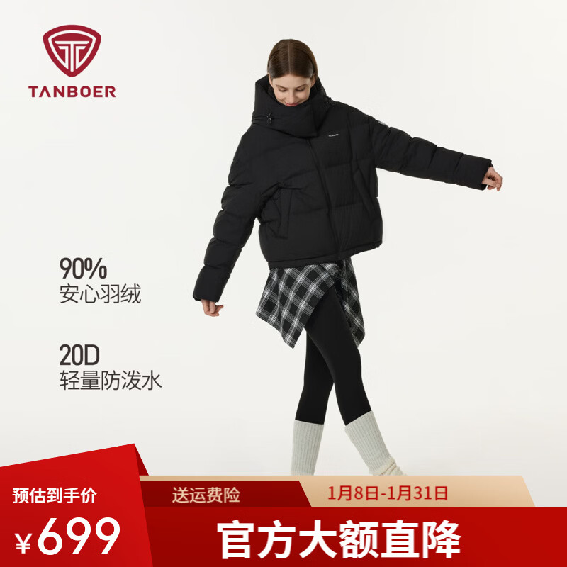 坦博尔【周也同款】泡芙羽绒服女短款可脱卸帽保暖保暖外套TB5530328D 黑色 XS (155)