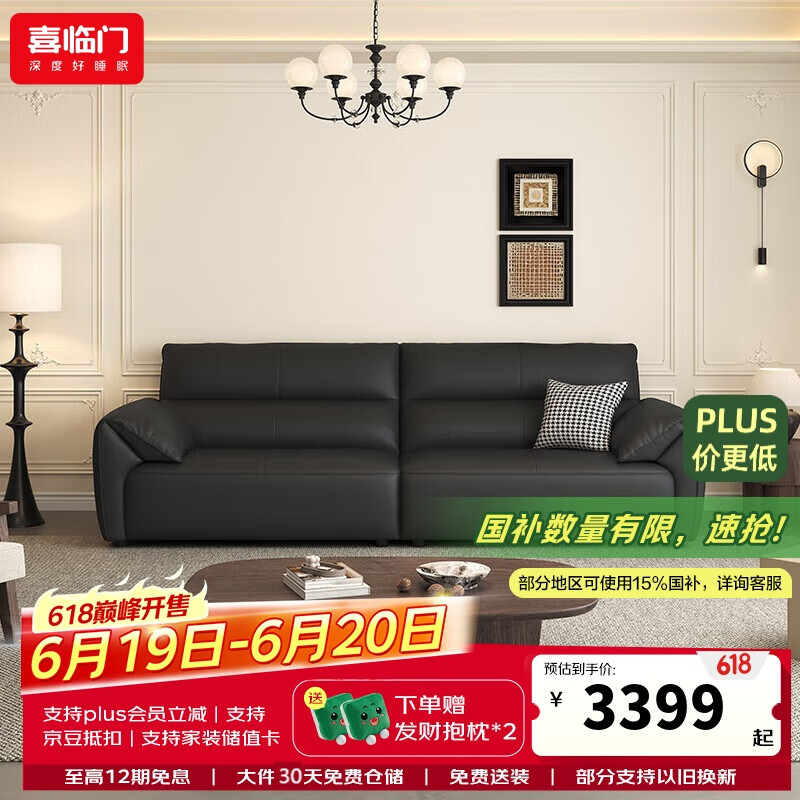 喜临门真皮沙发客厅意式极简头层牛皮沙发 小飞象 桑葚黑 四人位 260cm