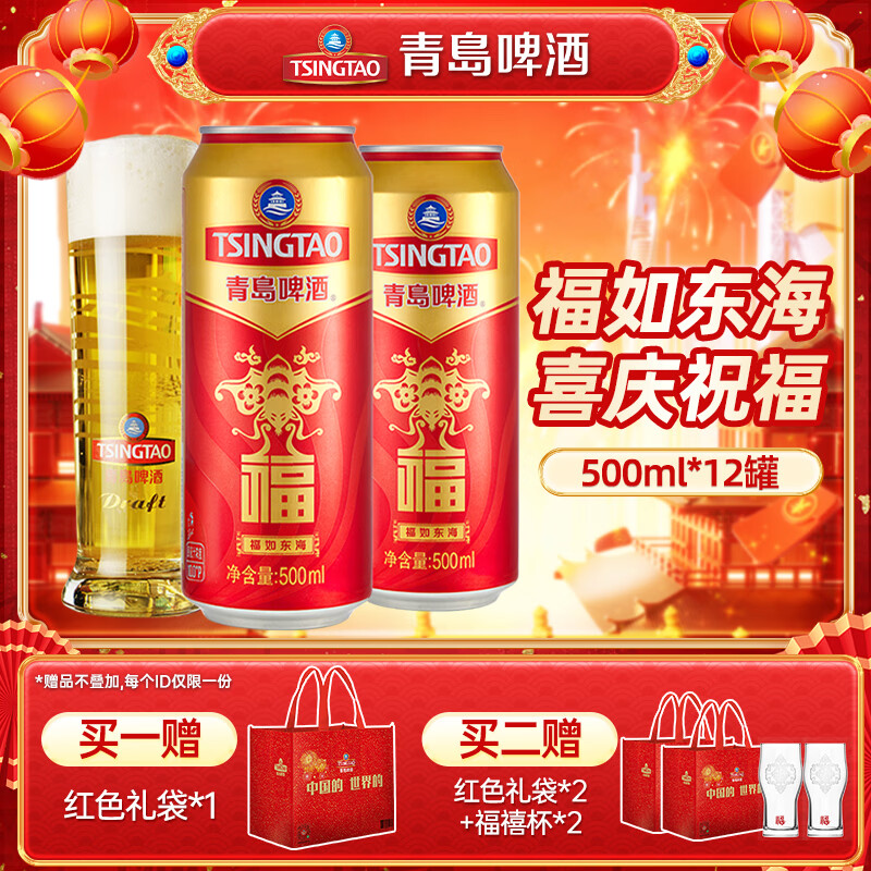 青岛啤酒(TsingTao)福如东海喜庆年货佳节啤酒送礼寿宴红罐祝福 500mL 12罐 整箱装