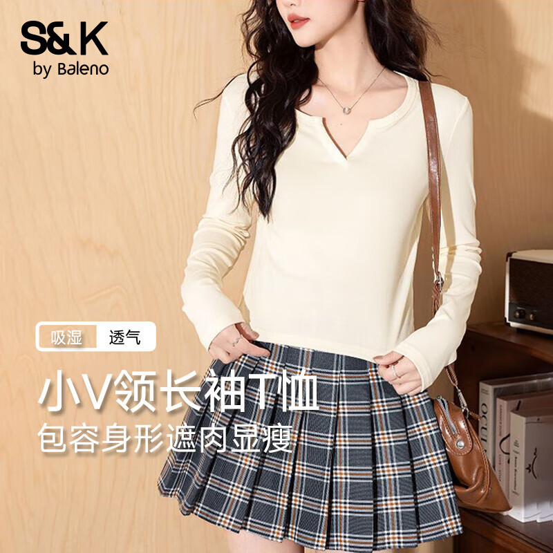 班尼路BALENOS&K小V领紧身长袖T恤女2025年春秋女装新款潮流简约时尚通勤上衣 杏#纯色 L