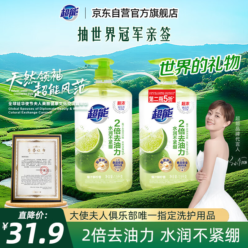 超能爆汁鲜柠洗洁精1.5kg*2 加浓 快速去油污 可直接清洗水果宝宝餐具