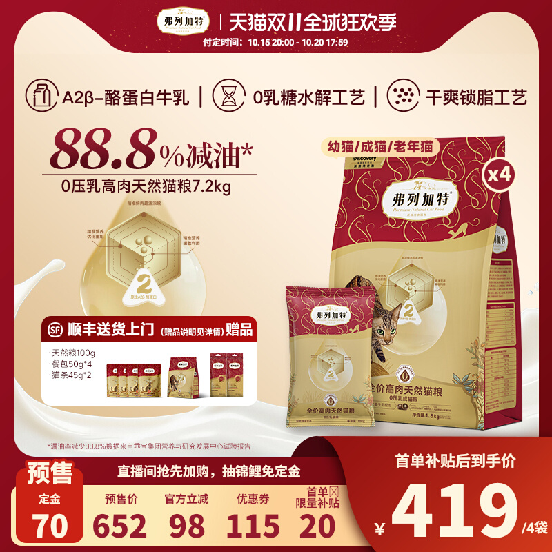 【加购15日付定】弗列加特&Discovery88.8%减油0乳糖鲜肉天然猫粮