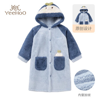 英氏儿童睡衣家居服男童女童睡袍冬季加绒加厚浴袍A类保暖连帽睡衣 企鹅蓝色 110cm