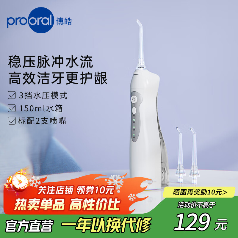 博皓(prooral)电动冲牙器便携式洗牙器牙齿冲洗器水牙线洁牙器牙缝清洁器剔牙神器牙垢去除工具正畸呵护手持立式 云白| 3种模式| 动力升级
