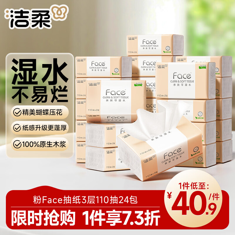 洁柔抽纸 粉Face柔韧3层110抽*24包 可湿水纸巾卫生纸 抽纸整箱
