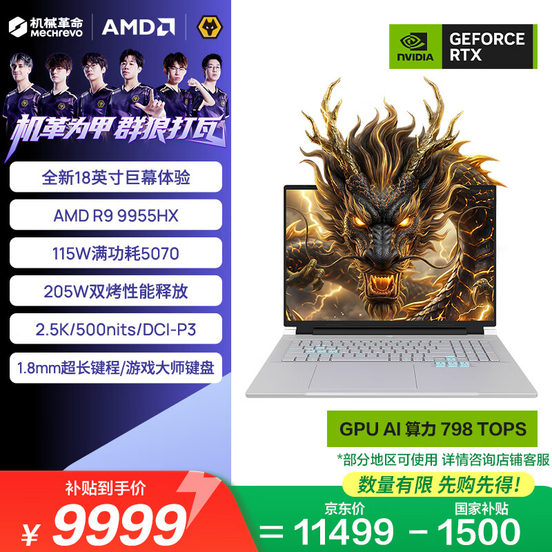 自营机械革命苍龙18 Pro 游戏本笔记本电脑(R9-9955HX 16G 1T RTX5070 2.5K 180Hz)灰