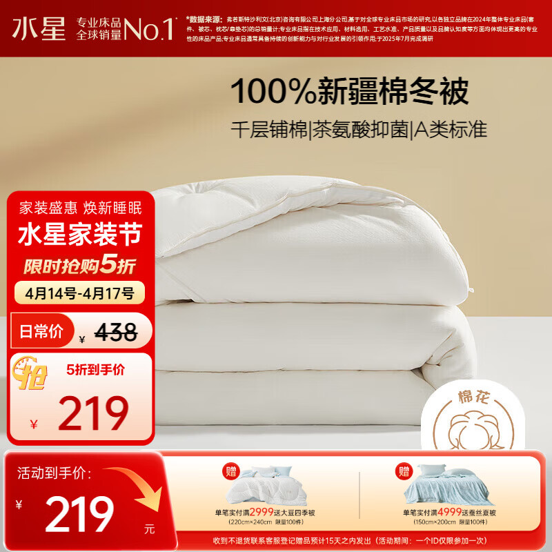 自营水星家纺新疆棉花被纯棉被子冬季棉被芯冬被双人约6.2斤JDear京东定制款