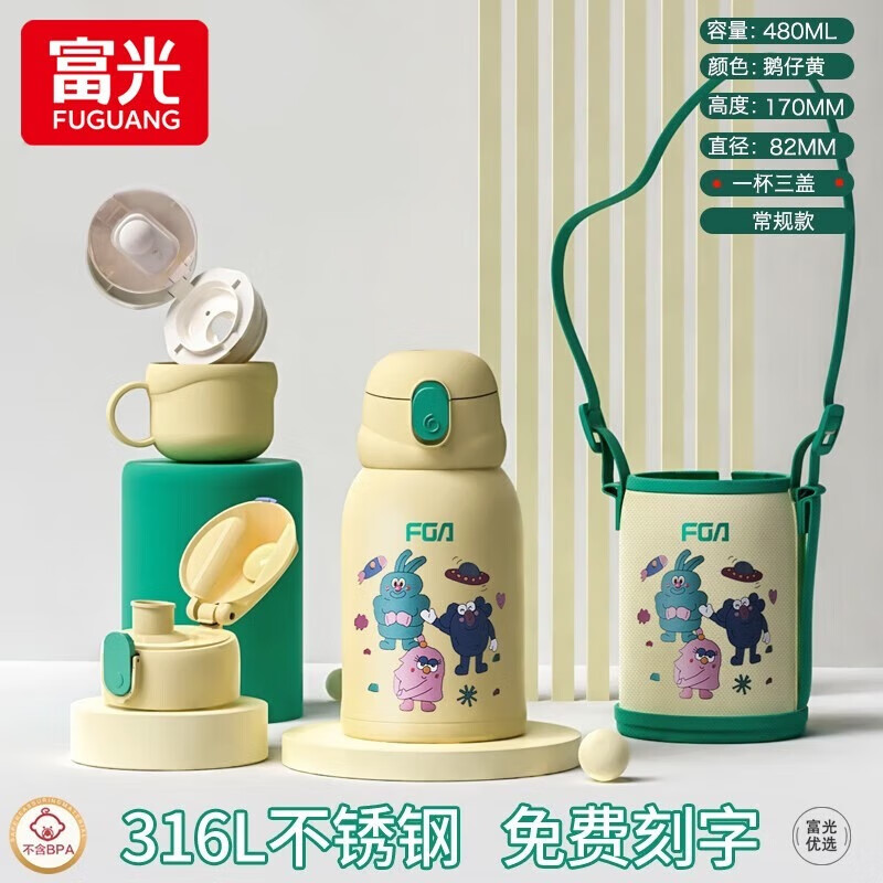 旗舰店富光儿童保温杯子316不锈钢水杯小学生幼儿园男女两用大容量吸管杯 鹅软黄+一杯三盖 480ml