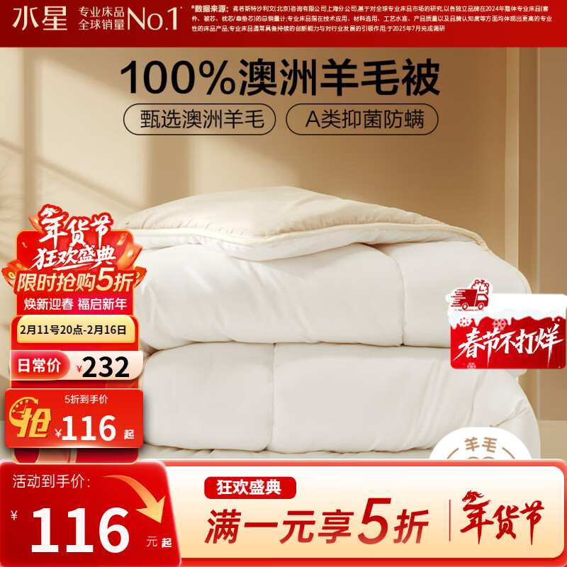 旗舰店水星家纺出品百丽丝羊毛被 100%澳洲羊毛进口冬被 A类保暖秋冬单双人被芯 四季被【A类&100%澳洲羊毛】 150cm×210cm(适用0.9/1.2米床)