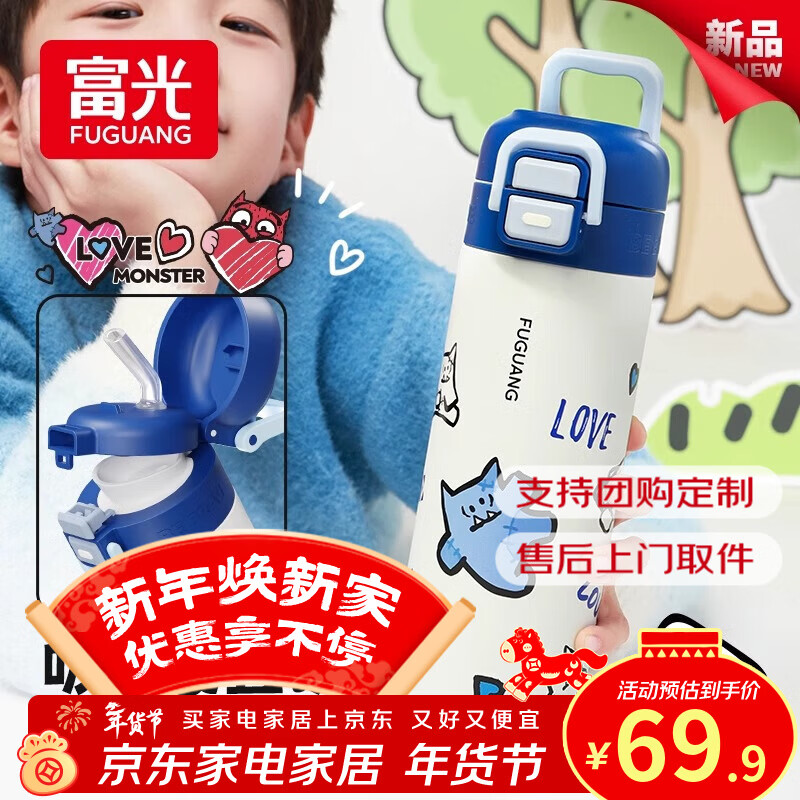 旗舰店富光儿童保温杯双饮大容量316L不锈钢吸管水杯子学生男女生生日礼物 小蒂蓝(一杯双饮)500ml