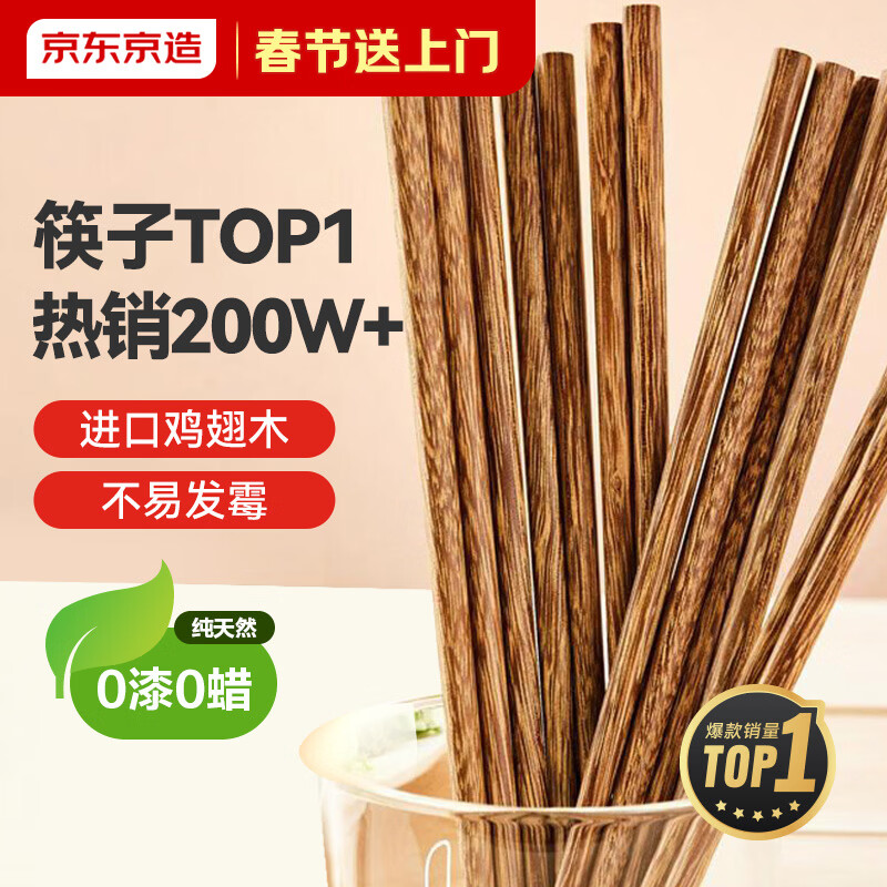自营京东京造 筷子 家用食品接触级餐具实木防滑鸡翅木原木【无漆无蜡】10双装
