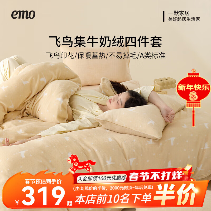 旗舰店一默四件套冬季被套床单枕套加厚保暖宿舍双人套件飞鸟集牛奶绒四件套 羽纱米 床单款 (被套150*200cm)