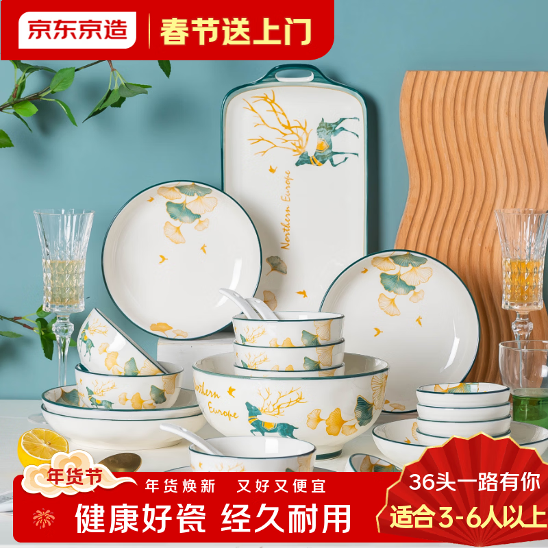 自营京东京造 碗盘餐具整套 碗具碟子套装乔迁之喜陶瓷家用 一路有你36头